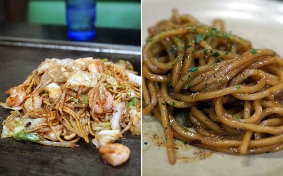 それから焼きそば。イカとエビを具材に選んで焼いてもらうと、厨房の中からブーンと鈍い音が響いてきます。
