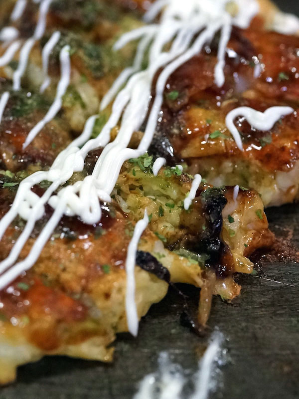 キャベツたっぷり。ふっくらとした山芋多めの生地がフワリと軽くてやさしい。箸で食べようとするとほろりと崩れるほどで、コテを使ってハフハフ食べる。