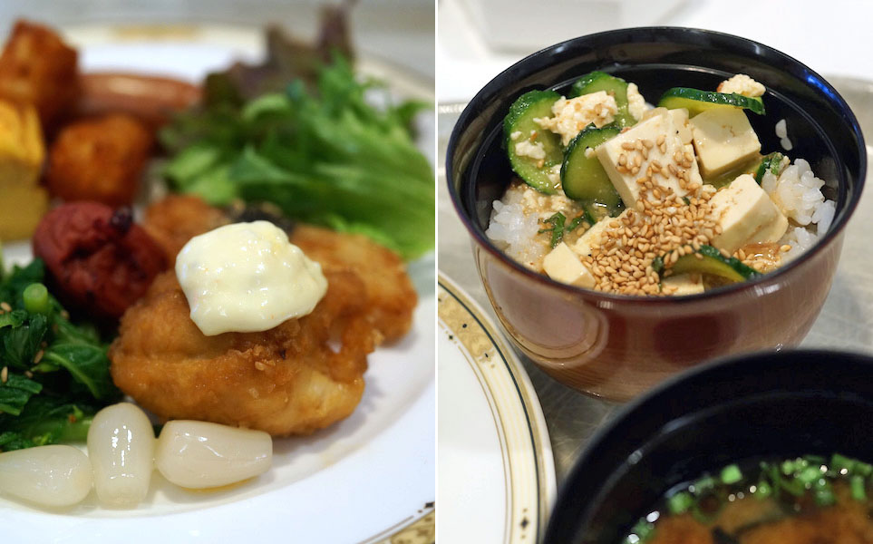 熱々ご飯に冷たい味噌汁。カツオの香りが濃厚で、砕いた豆腐にキュウリに大葉、それからゴマと、お酒で疲れた朝のお腹がスッキリしてくる。