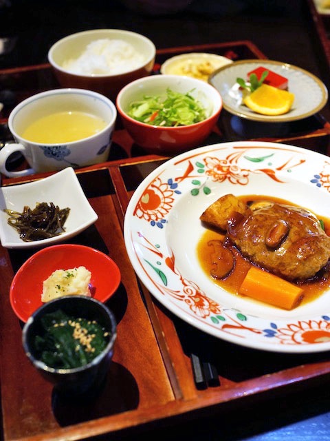 合い挽き肉のフックラとした昔ながらのハンバーグには目玉焼きがドッシリのって、なんだかめでたくナツカシイ。
