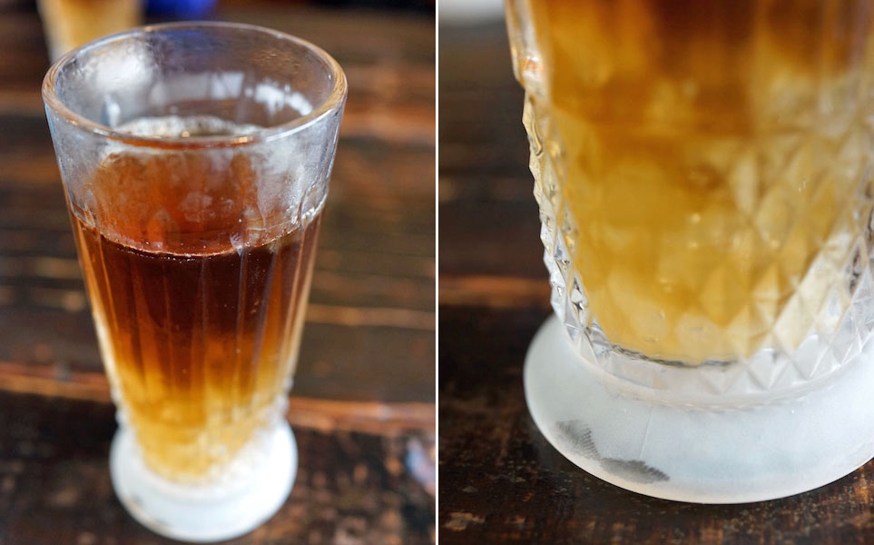 水を吹きかけ、中にはおいしい水をちょっと注いでフリーザーで保管する。ガラスの芯まで冷たく凍って、お茶を注ぐと冷え冷えになる。