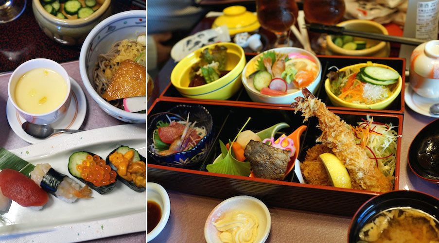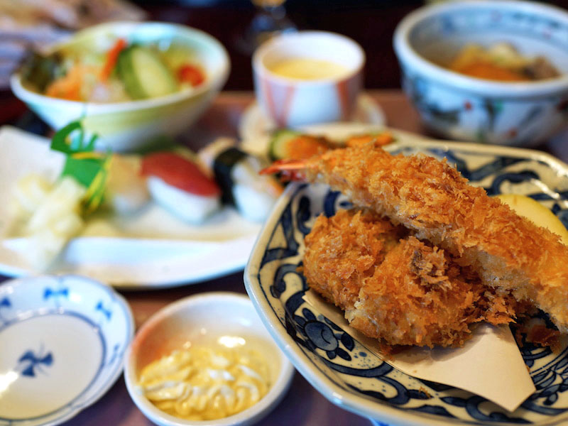 シニアな大人のお腹にはこんな程度の揚げ物で十分満足できるのですね。それにお寿司や蕎麦やうどんを組み合わせ、季節の料理に茶碗蒸し。