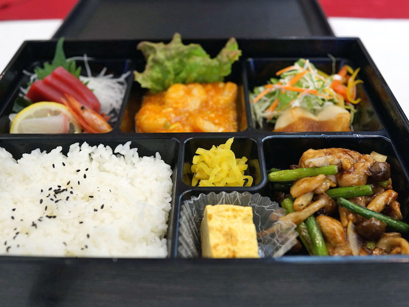 松花堂弁当の中に刺身と、中国料理。牛肉とニンニクの芽を炒めたものや、エビチリ、ホタテの蒸し物と、ご飯のおかずにほどよい料理があれやこれやと。