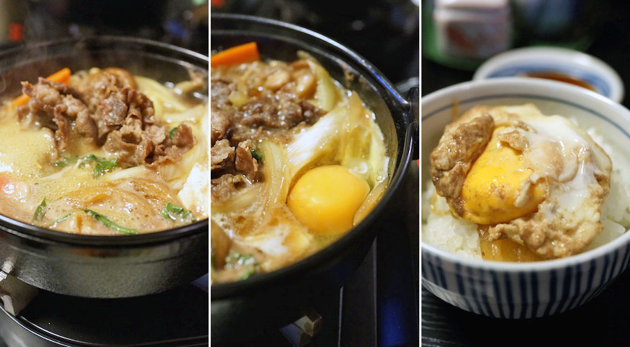 野菜を半分。肉も半分食べたところで、玉子が煮えて、それをご飯の上にのっけてハフハフ食べてお腹を満たす。