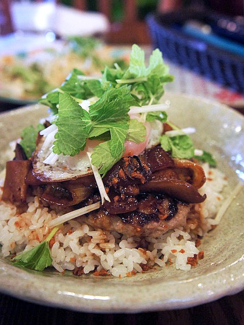 ザクッと歯切れる赤身のおいしいハンバーグが、ホロッと崩れてご飯に混ざる。