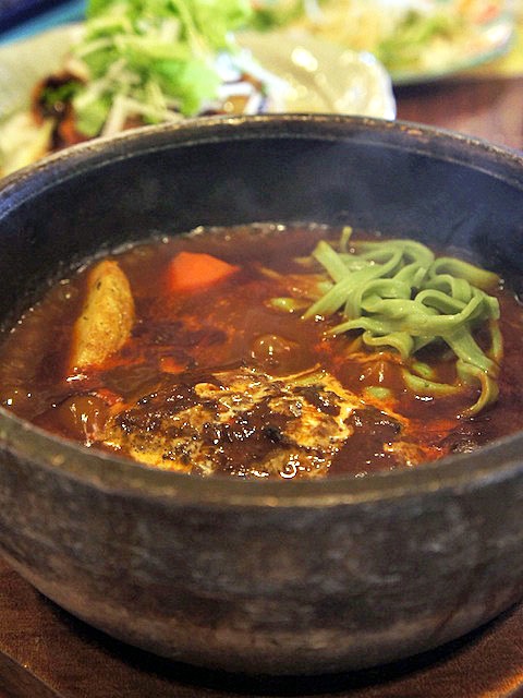 スプーンでプチュンと一口大にちぎってソースと口に運ぶと、肉がムチュンと歯ごたえ頑丈。