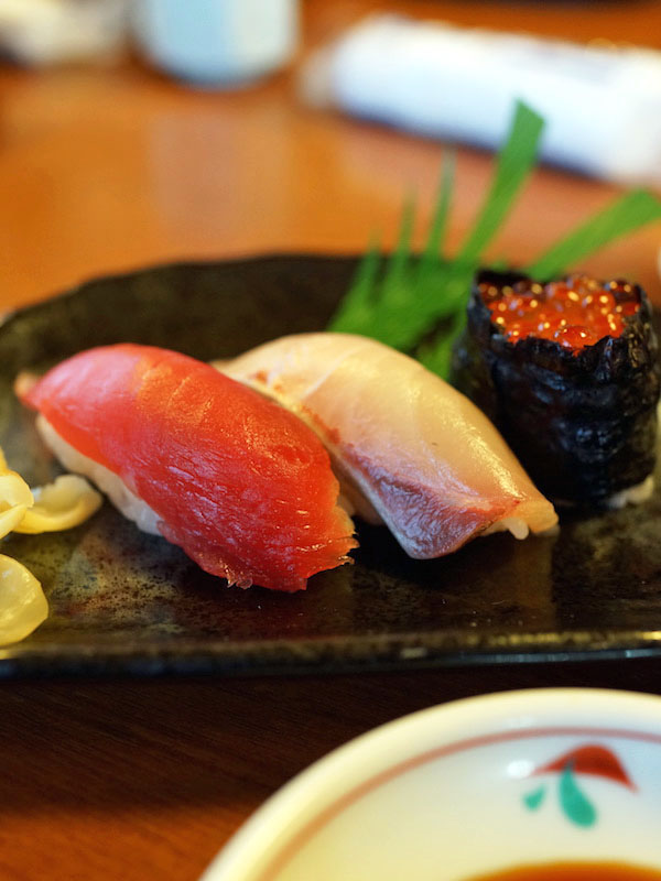 この天ざるににぎり寿司が付いてくる。マグロのにぎり。ハマチにイクラの軍艦とたった3貫ながらも、どれもがおいしい。キリッと酸味のきいたシャリ。ネットリとした魚の食感、プチッとはぜるイクラの風味。