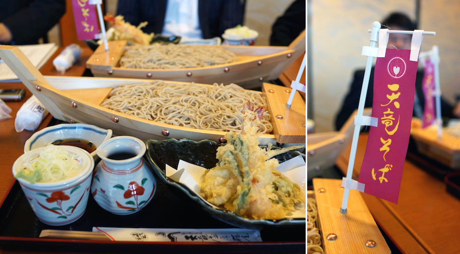 勉強会の会場自体が地元で元気な蕎麦の店。「天竜そば松風庵」という店で、天竜渡しの船をイメージした器。天竜そばの幟旗も勇ましく、天婦羅従え目に麗しい。