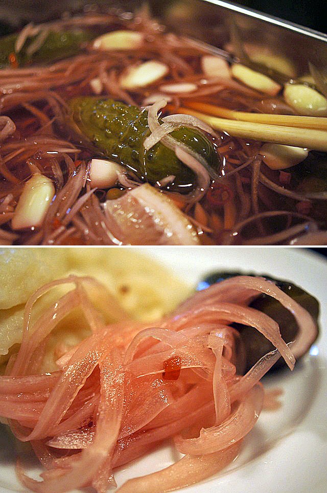 玉ねぎはシャキシャキとしたそれそのものの歯ごたえ、歯ざわり失わず酸っぱく辛くなっている。