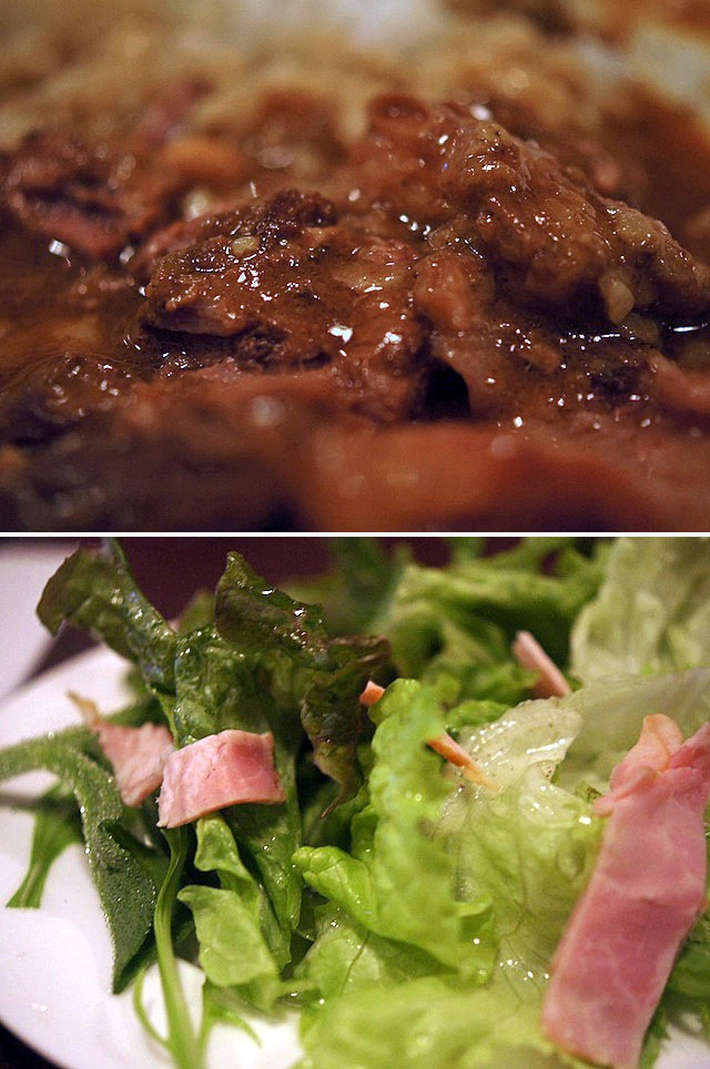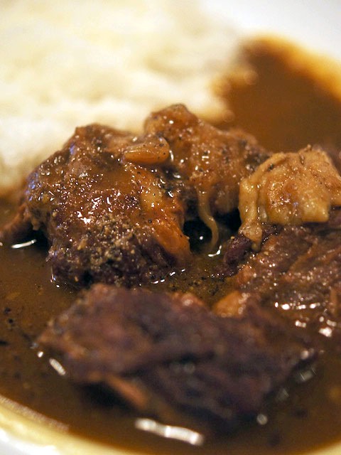余分な脂を丁寧にとった肉を塊のまま焼き上げ、それを煮込んだ牛肉がゴロゴロ、全部で100gほど入った肉食系の姿にウットリ、食欲が湧く。