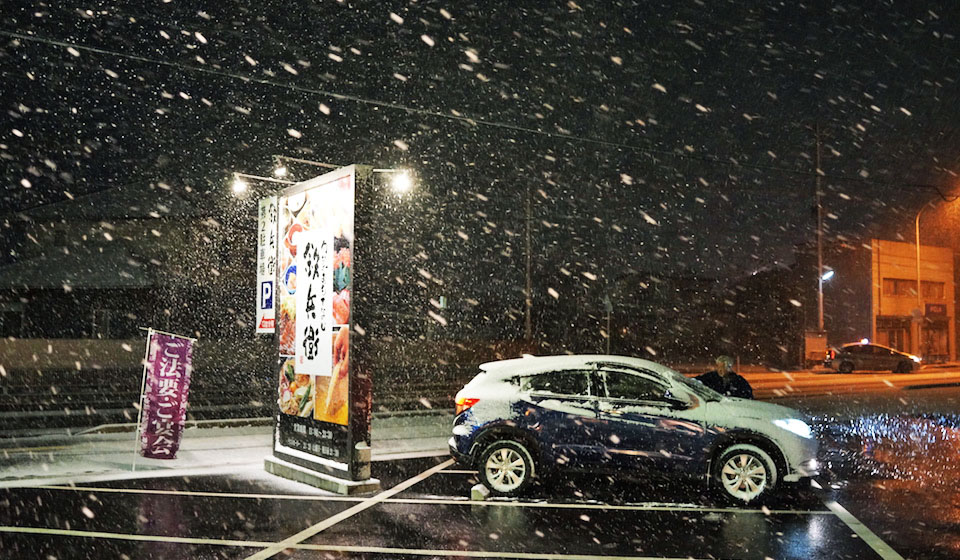アオサの味噌汁で夜のお腹をあっためて、さぁ、二次会にでかけましょうかと勇んで表にでかけたら…、なんと雪が降っております。