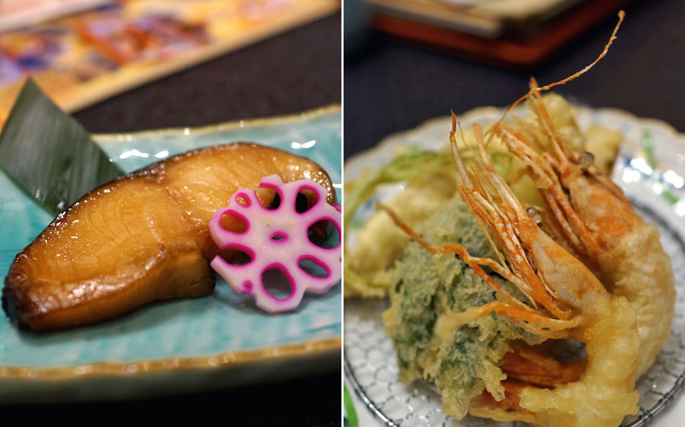 銀鱈を醤油漬けにしてこんがり焼いたの。甘エビを贅沢にも天ぷらにしたのは、頭や足までサクサクおいしく味わえる。