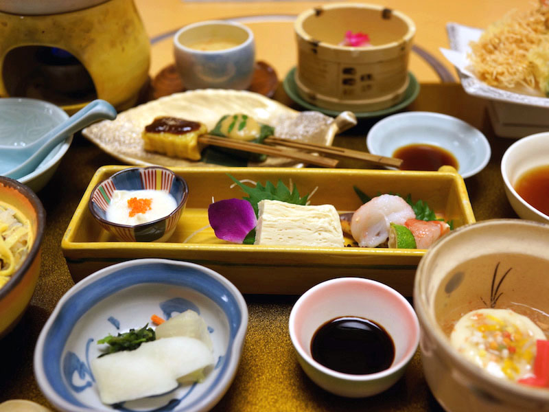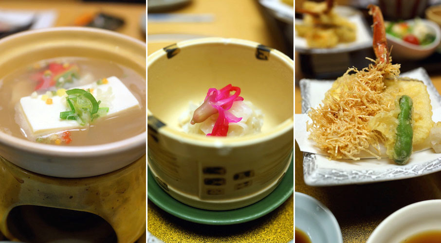 豆腐の小鍋にできたて豆腐と、豆腐を使った料理にかに刺し。天ぷら、蒸し物などがあれこれキレイにお盆の上にならんでやってくる。