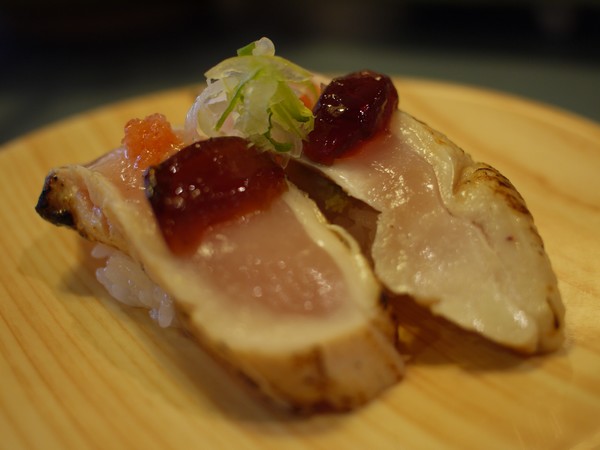 焼けた鶏の脂の香りがまた鮮烈で、これは普通のすし屋じゃ食べれぬ、遊び心に満ちた寿司。
