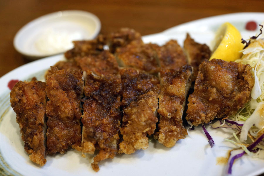 味を加えた鶏のもも肉に粉を叩いてスパイス混じりの片栗粉。それをカラリと揚げたもの。