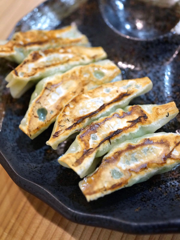 皮に野菜。それ以外のものはほぼ使わず出来上がっている野菜餃子で、生地からすけてみえる緑の色はキャベツやネギと言った具材の色であります。