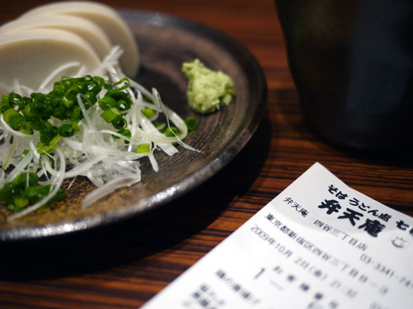 分厚く切られたかまぼこと、ネギにそれからわさび漬け。