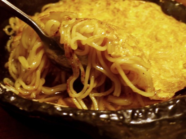 醤油ベースのスープで煮込んでとろみをつけたのをタップリしいて、それを麺で蓋をする。