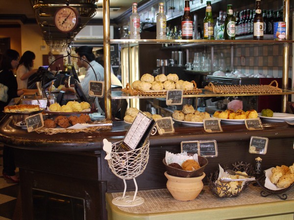 お店に入るとフランス菓子と英国風のお茶菓子がならぶカウンターがあり、フランス的なるカフェオレがセルフサービスにてたのしめる。