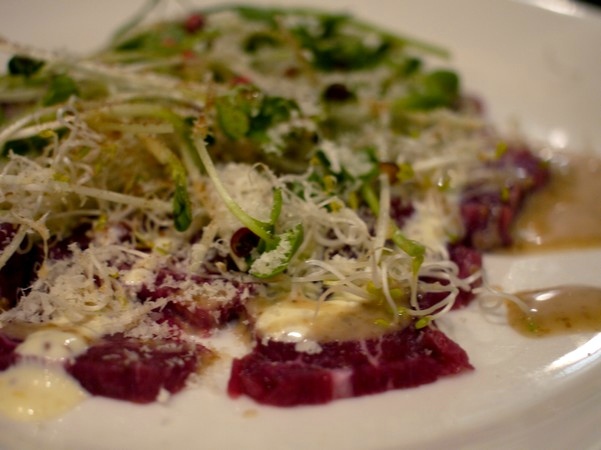 生の牛肉を普通は薄くそぎきって、野菜やソースと一緒に丁寧にお皿に飾る。