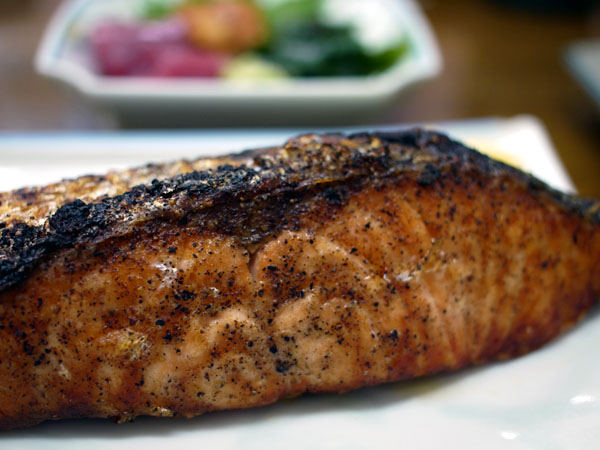 ここのスモークサーモンは自家製の、だから分厚いサーモンの半身をそのまま燻製にする。