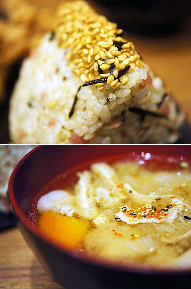 ここ独特の分厚い三角形をしたおむすびの上に、パラリと胡麻が彩り添えて目にもたのしく、口の中でも散らかる食感、オモシロイ。