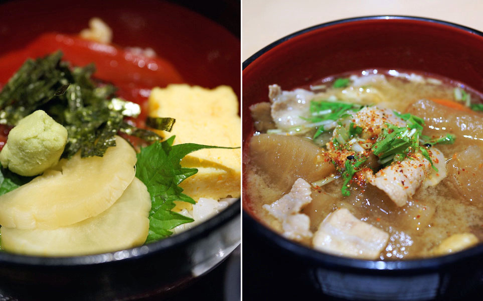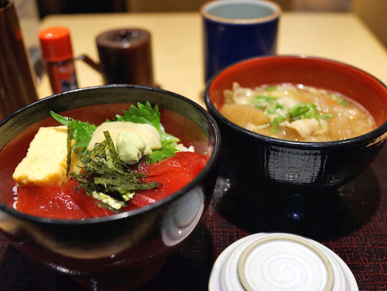 マグロの赤身の漬け丼と、豚汁が一緒になったうれしいセット。