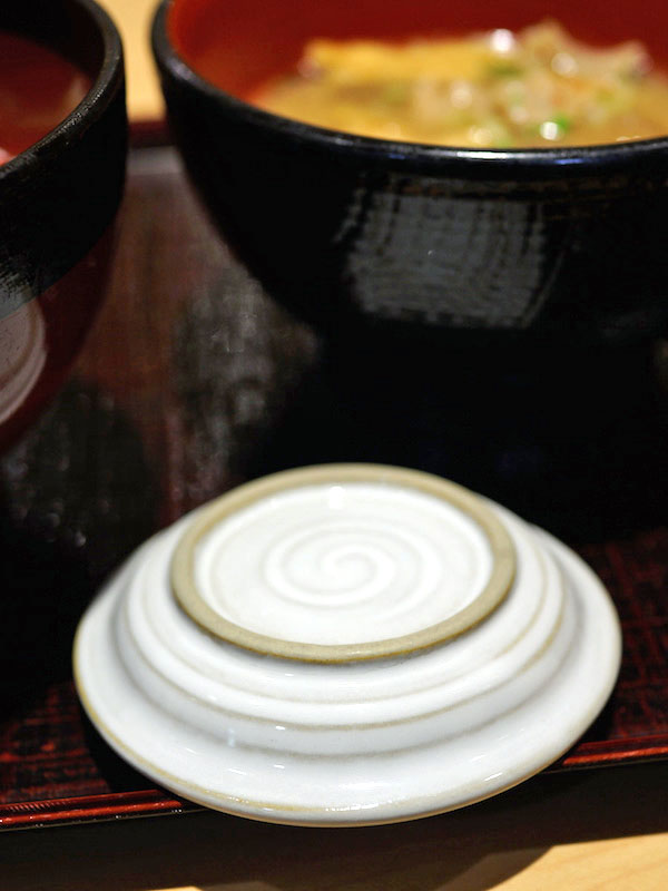漆の丼。塗りの椀。そこに醤油の小皿がやってくるのだけれど、それがこうして裏返し。