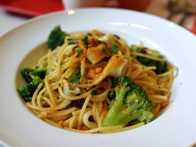 スライスニンニク、赤唐辛子の風味がドッシリとした味のベースにイカに茹でたブロッコリ。具だくさんにしてそこにおろしたカラスミで、味に風味をつけてやる。