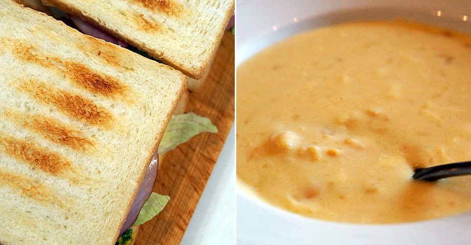 空気をタップリ含ませたハムやレタスを潰さぬように、一気にスパッとナイフをいれて切り分け、ハフっと食べると食感軽やか。