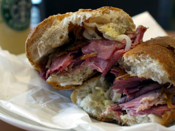 ライ・ブレッドにマスタードたっぷりが大好きです。あのNYのKatz’sのも美味しいですが、昔働いていたボストンに、巨大で旨いパストラミ・サンドをだすデリがありました。狭いカウンターにはそこでローストしたでっかいお肉の塊、ターキーにビーフにハムなどなど...を目の前でスライスしてくれるんですが、サンドイッチといってもお肉だけで1.5パウンドくらい、薄切りを15cmくらいのっけて、どっかーん!ってくるんです。店内は男性ばっかりで、みんなガッツンガッツンたべてて、女子は殆どみかけませんでした。久しぶりに食べたくなってしまいました。