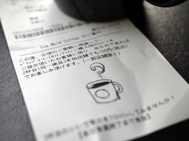 ドリップコーヒーを飲んだレシートで、もう一杯分が100円になるってうれしいコレ。