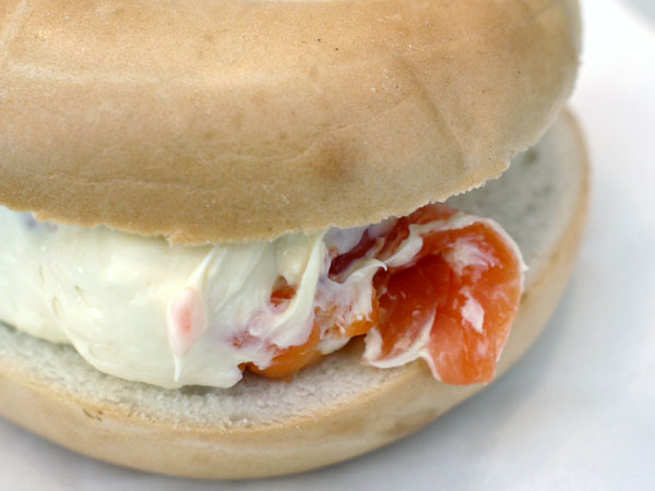 ペロンとスモークサーモンの、オレンジがかったピンク色がベーグルの端から顔のぞかせる。