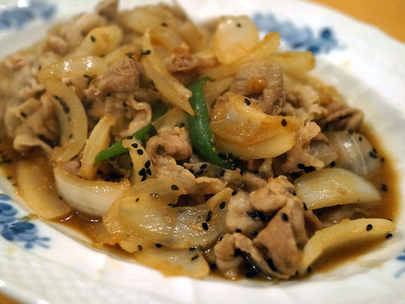 くし切りにした玉ねぎをごまの油でサクッと炒め、そこに豚肉。味醂と醤油とタップリ擦った生姜をくわえ、最後に注いで詰めて完成。黒ゴマをタップリふりかけお皿に移してハフハフ食べる。