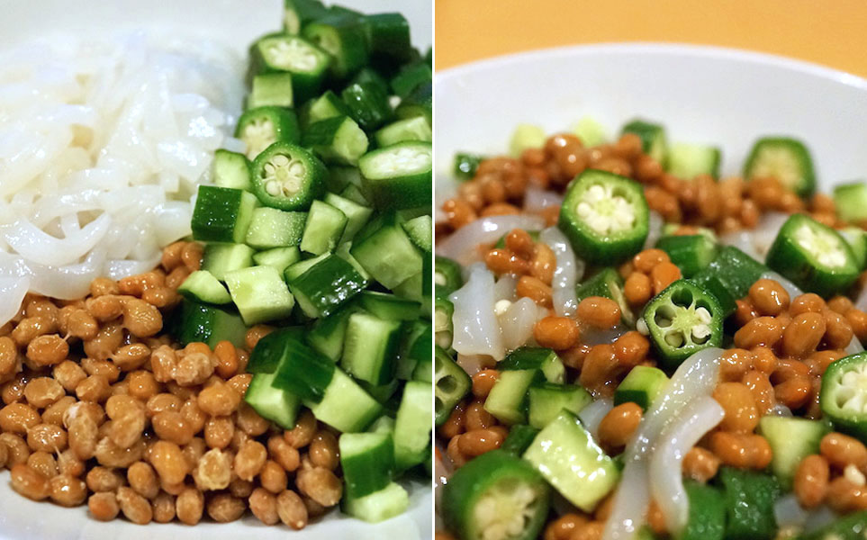 納豆に細切りにしたイカと小さなサイコロ状に切ったキュウリ。固めに茹でたオクラをまぜてそこに少々、出汁醤油。