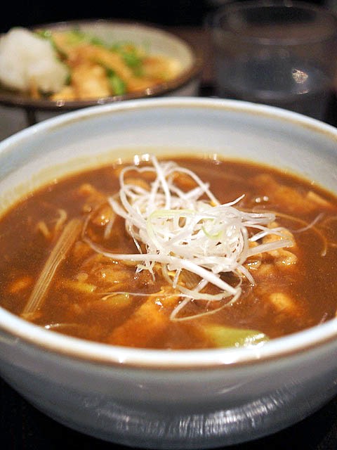 うどんと違って細くてなめらか、表面ザラザラしている蕎麦ががカレースープをタップリ口へとたぐりよせ、口の中の隅々がカレーまみれになってく感じがするのがうれしい。