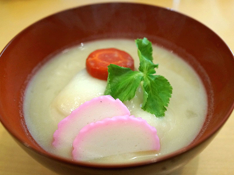 大根を土台に上に餅をのせ、かまぼこ、ニンジン、結んだ三つ葉を飾って仕上げ。