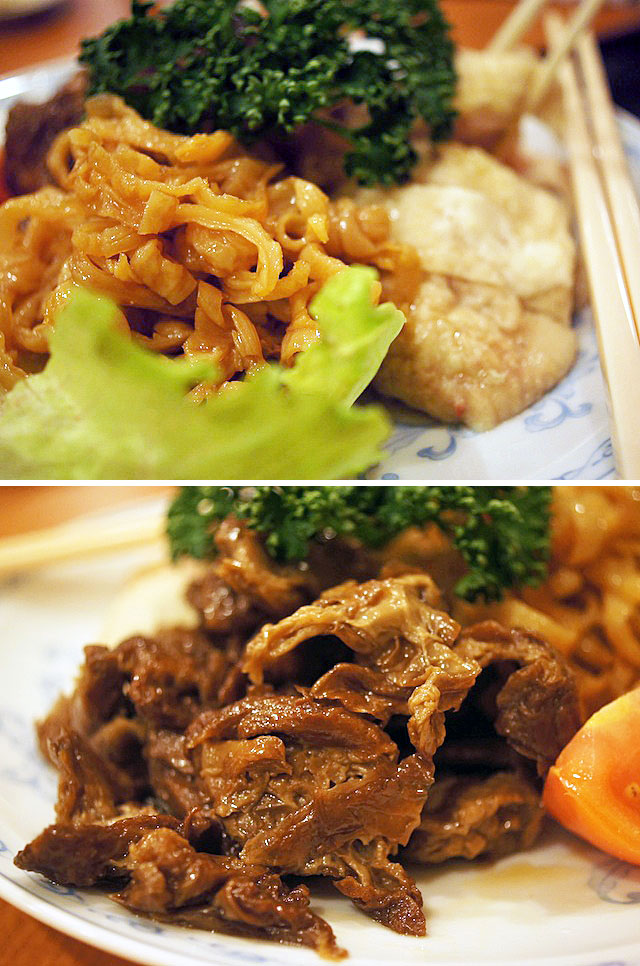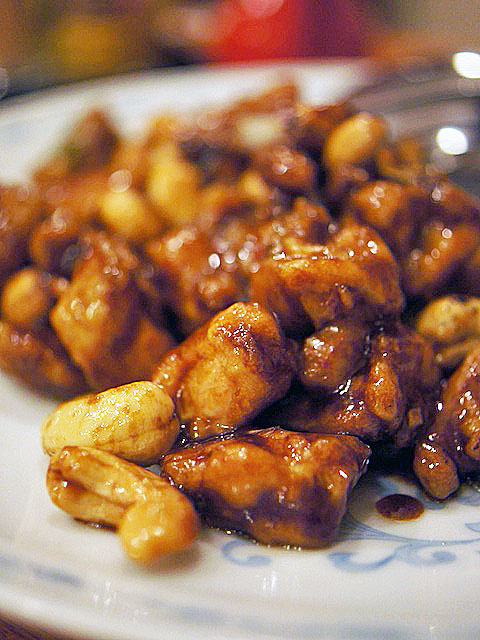 乾燥させた豆腐を中国醤油に漬け込む、見た目はまるで肉のように見えて実はフッカリ、キュッキュと歯が痒くなるほどの歯ごたえたのしい前菜。