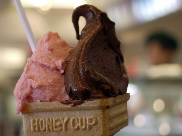 ダークチョコレートと、ストロベリーミルクをコーンに乗っけてもらう。