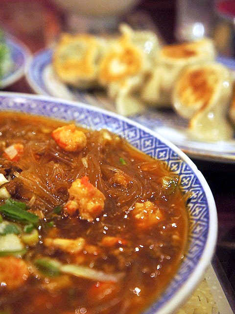 蟹肉と春雨の辛子煮込みと餃子をたのみご飯のおかずにして食べる。