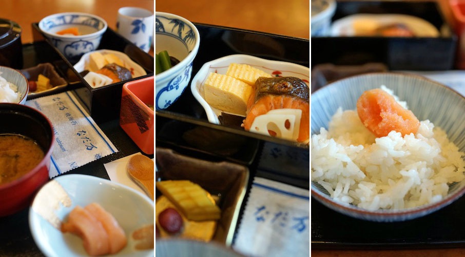 だからなんだか今朝はたのしい…、炊きたてご飯に焼き茄子の汁、出汁巻き玉子に焼鮭、焼き海苔、炊合せ、博多名物の明太子がつき、他に何が必要だろうと思えど答えが見つからぬほどの納得の朝。
