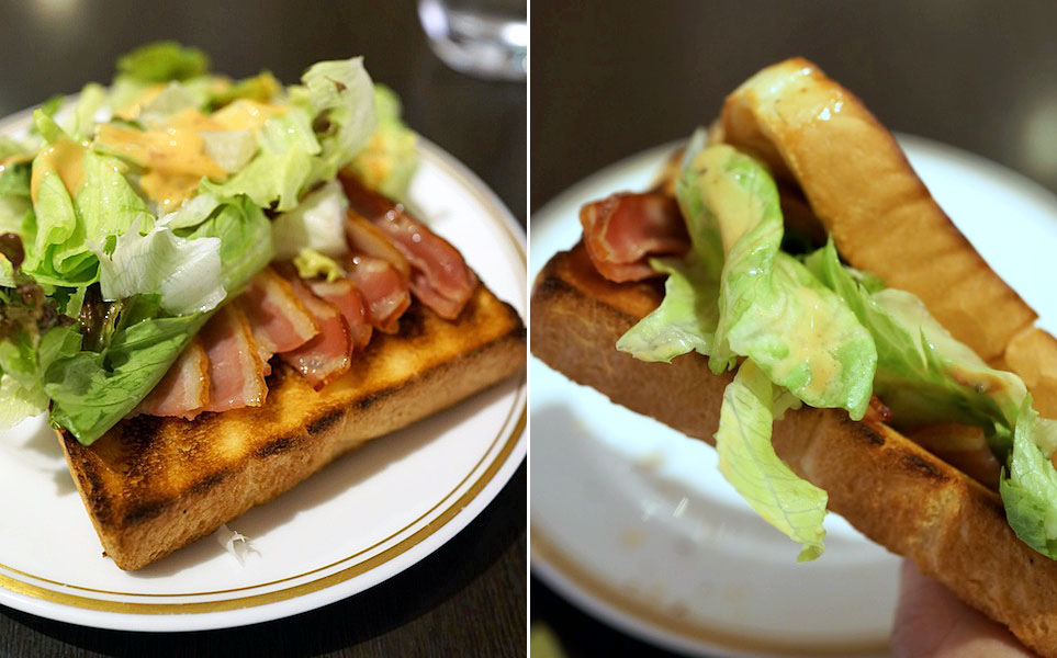 そのトーストに、ベーコン並べてレタスをドッサリ…、サウザンアイランドドレッシングをポッテリおいた。