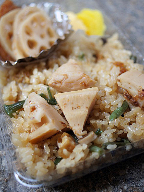 ペラペラのプラスティックの箱に入った炊き込みご飯。