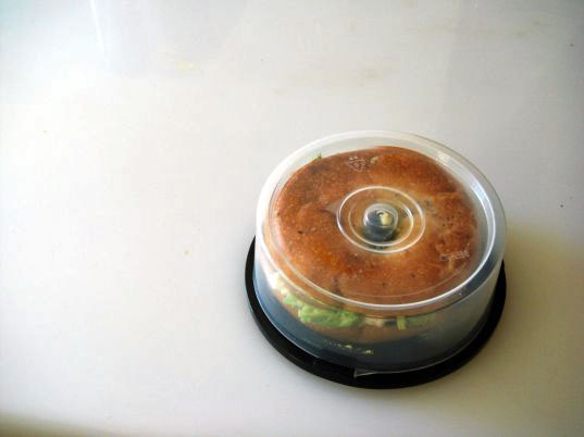 光学メディアを串刺しにしている棒が、ベーグルの穴をしっかり固定してくれるというこの構造。