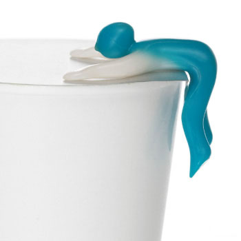 カップのへりに必死にしがみついて落ちぬように踏んばっている…、ように見えるかわいい人形。