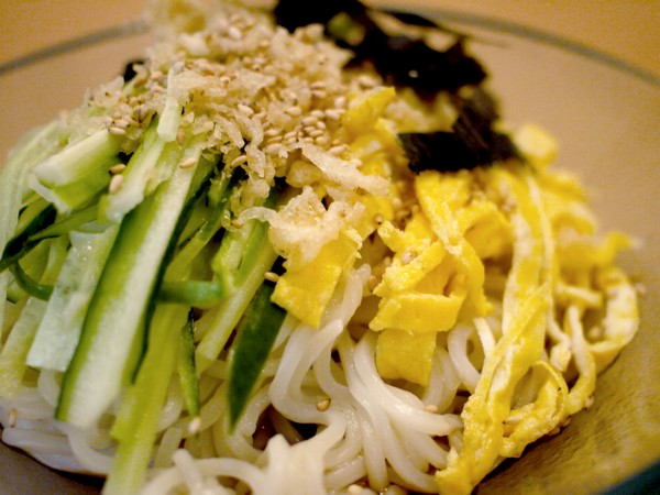 最近、かなりはまってる生の冷麦を茹でてしめ、ぶっかけ風にして食べる。