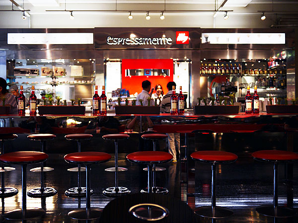 メタリックなテーブルとモダンな椅子がズラっと並び、トランシーなドラムンベースの音がズンズン響いてる。