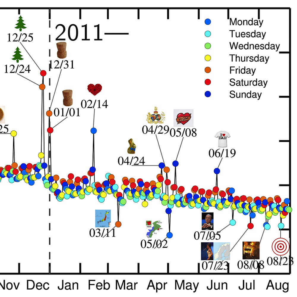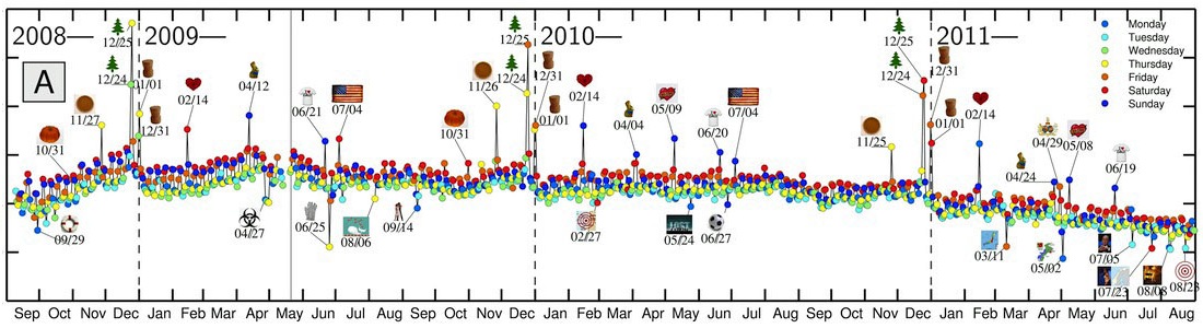 バーモント大学の研究チームが、Twitter上につぶやかれているすべての言葉を解析し、世界の幸福度を測る指標を時系列的にならべたモノ。