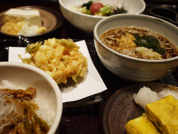 海老のかき揚げ天ぷらを別添えにした熱々のそば。