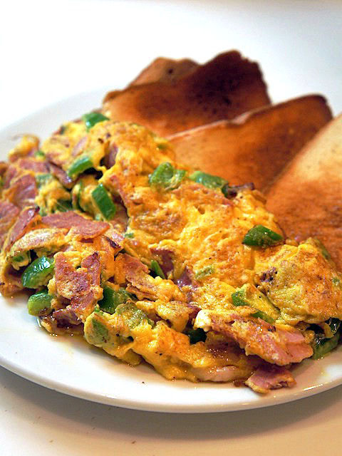 ハムとピーマンの卵とじと、ハムオムレツの間の子みたいなモノになる。